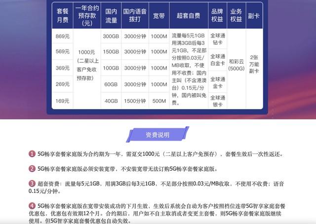 以269元档的5G畅享套餐(家庭版)为例,办理该套餐的用户可享受60GB通用流量+3000分钟起的国内语音及1000M宽带,可享受全球通金卡权益。不过移动的5G畅享套餐家庭版需要缴纳一定预存款,套餐生效后一次性返还。