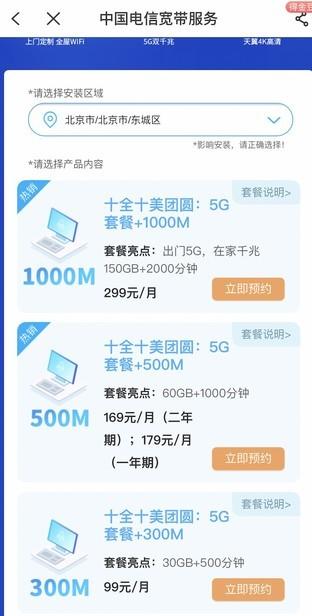 电信5G用户同样可选择5G号卡/宽带迁转融合套餐,不同地区提供的融合套餐不同。以北京为例,电信提供了十全十美团圆套餐,包括5G套餐(150GB+2000分钟语音)及1000M宽带在内,月费为299元。