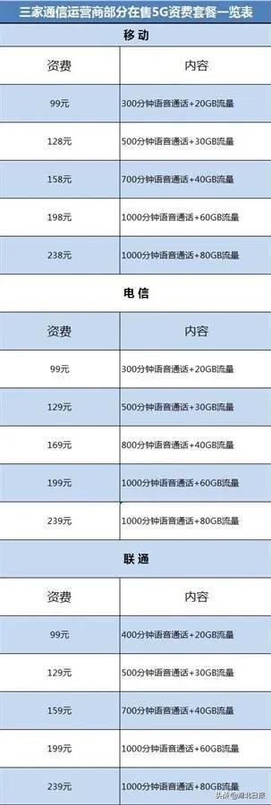 2019年,湖北5G正式商用,三大运营商公布5G资费套餐,电信、联通的5G资费最低、最高价相同,分别为129元/月,599元/月;移动5G资费最低、最高比前两者均低1元,可谓竞争激烈。今年3月,我省启动“5G服务春风行”专项行动, 向全省电信用户郑重承诺:年内5G资费水平将进一步下降,推出百元以内5G套餐。